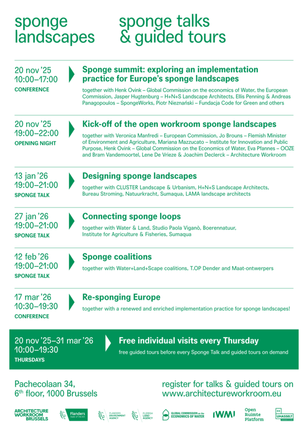 Everyone is warmly invited to celebrate the opening of the open workroom SPONGE LANDSCAPES and to kick off our collective four-month deep dive into the sponge landscape. Before we take you on a guided tour of the exhibition – with a festive drink in hand – we’ll put the ‘work’ in open workroom into action. During the day, the Sponge Summit will take place (by invitation only): an intensive working session mapping the state of sponge practices across Europe, informed by cases from Poland, Greece, The Netherlands and Flanders. The insights emerging from the Summit will feed into an evening conversation with Veronica Manfredi (Director for Zero Pollution, Water Resilience & Green Urban Transition at the European Commission) during the opening event, alongside the presentation of the full programme. In doing so, we set the tone for the months ahead: what should we develop within the open workroom to accelerate the shift from a conceptual sponge mission to a robust practice of implementation?